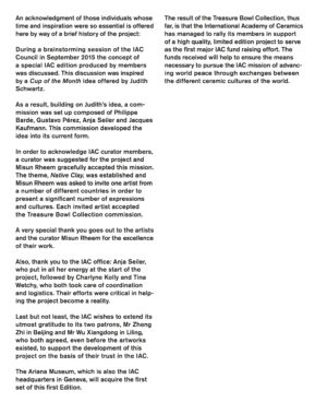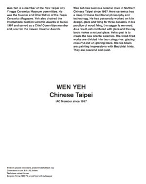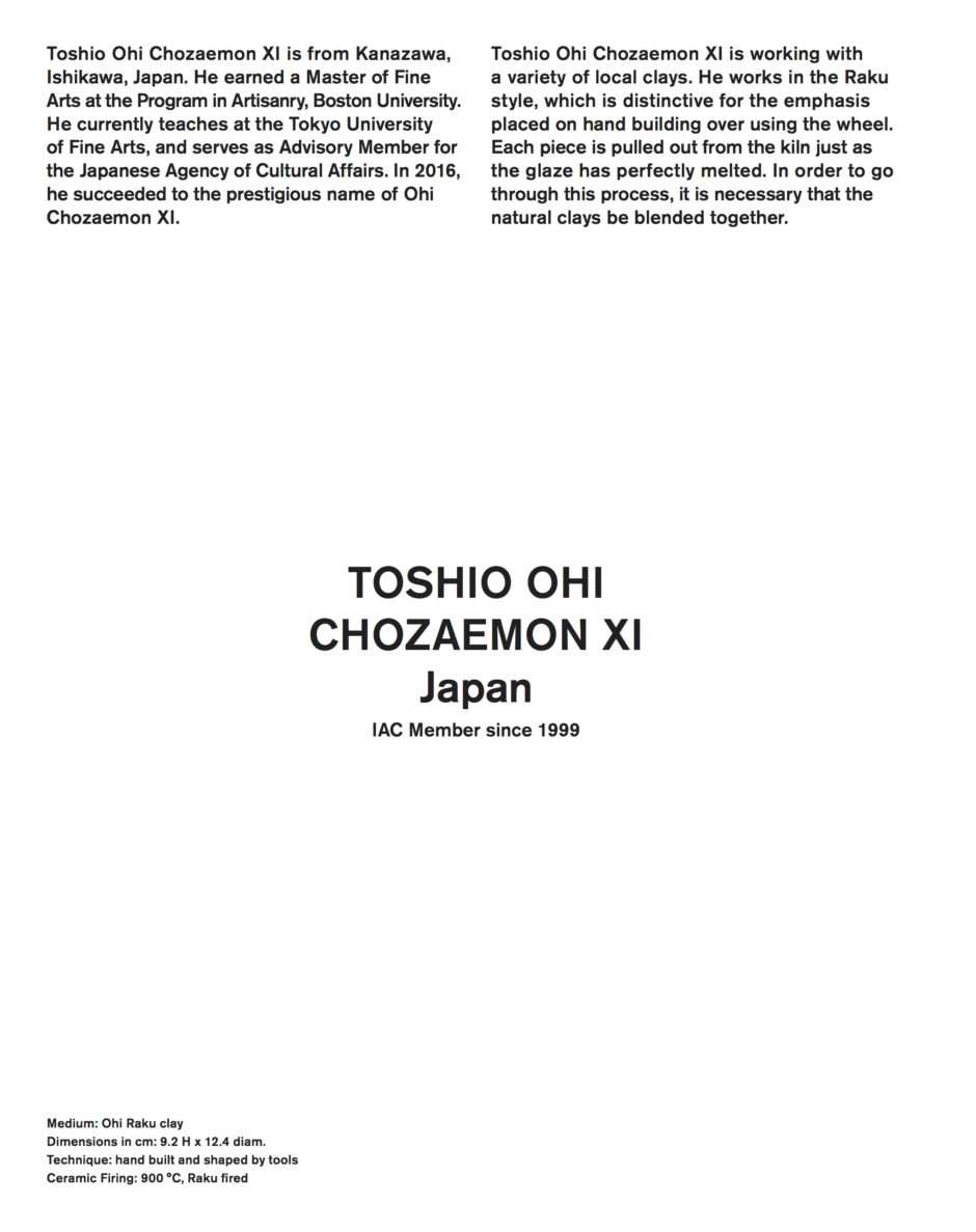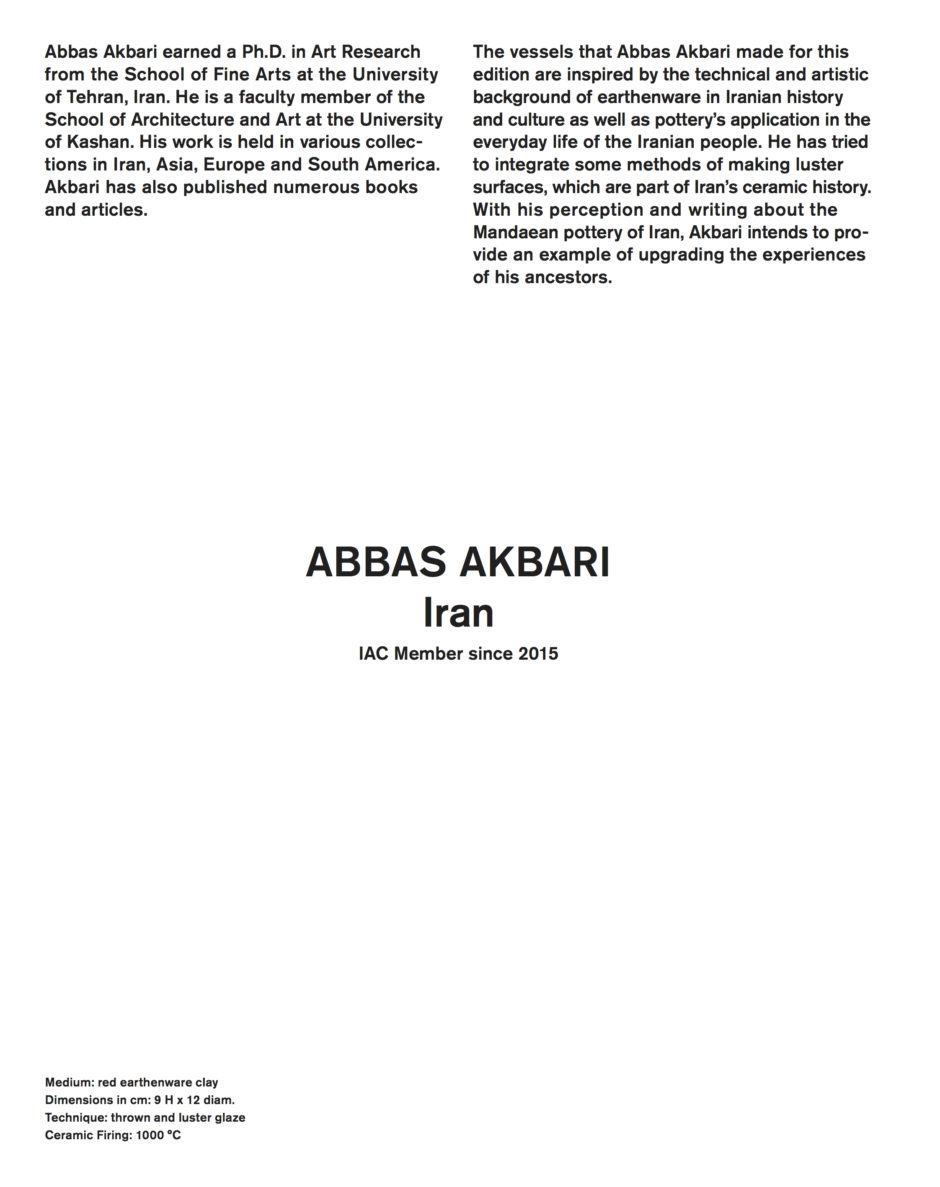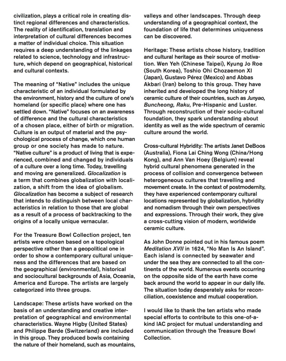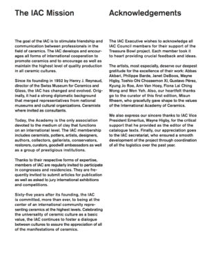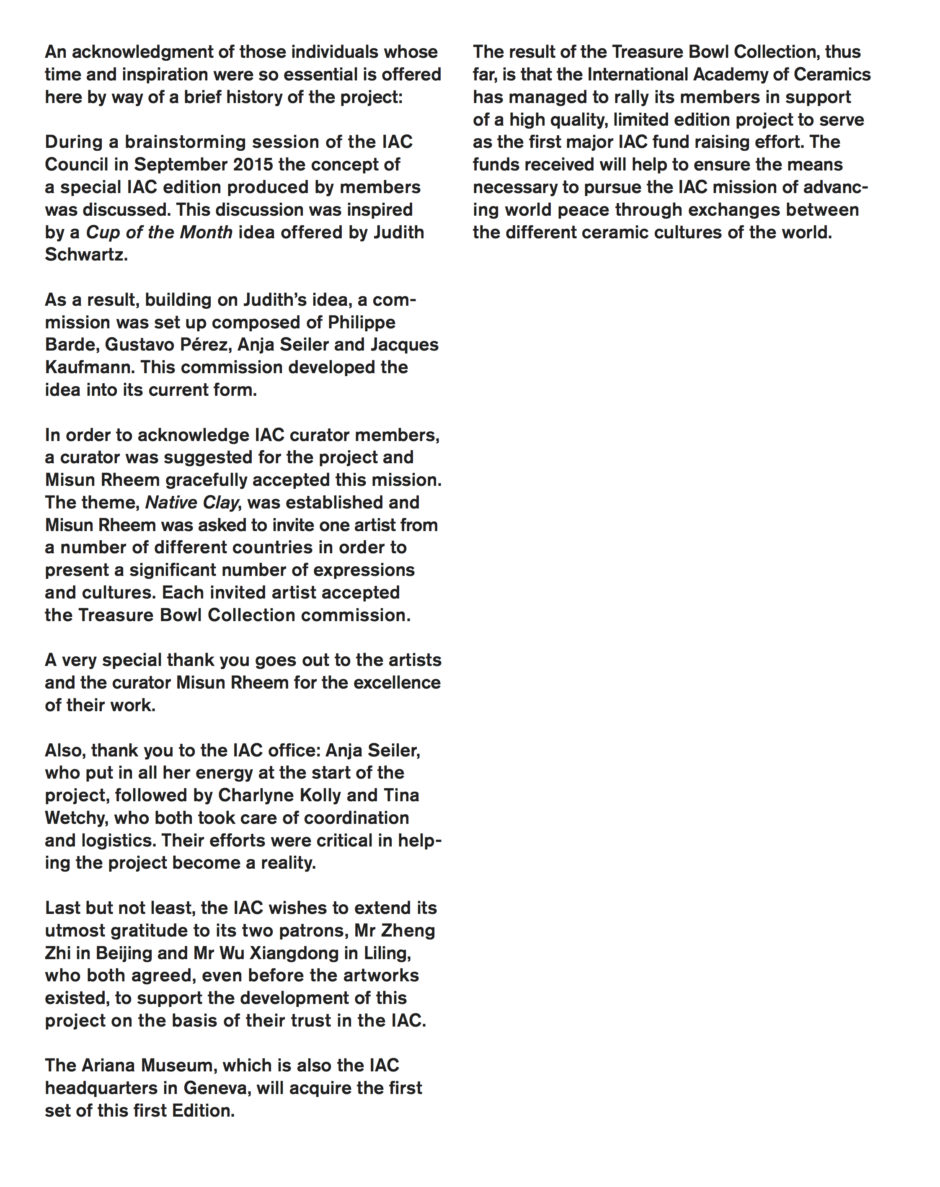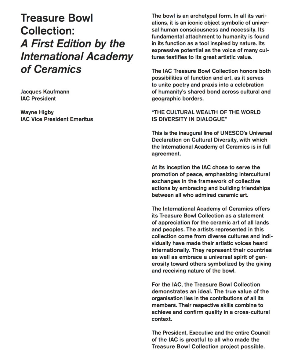 The International Academy of Ceramics Council is pleased to announce “The Treasure Bowl Collection” is open for acquisition. Developed from 2016 to 2018, this collection is unique in contemporary ceramics. Funds from the purchase of this collection will go to support the work of the IAC throughout the world. |