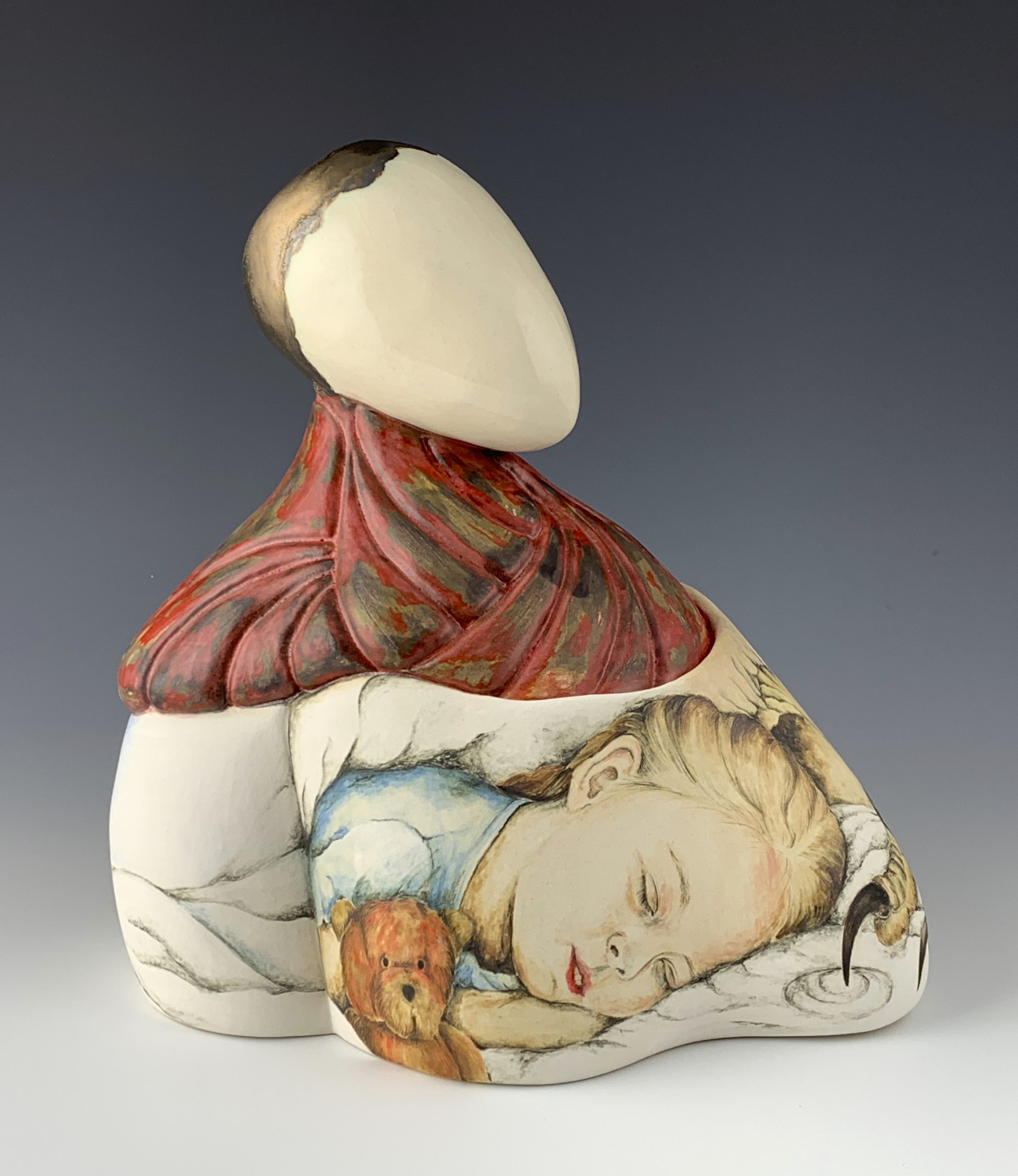 Before jumping into the creation of an actual work, I research the subject and make sketches to get a general idea how the work will look, but so often the idea develops itself and takes over. I like to let it go and follow the creative flow. All of my work is hand-built and hand-painted with underglazes.