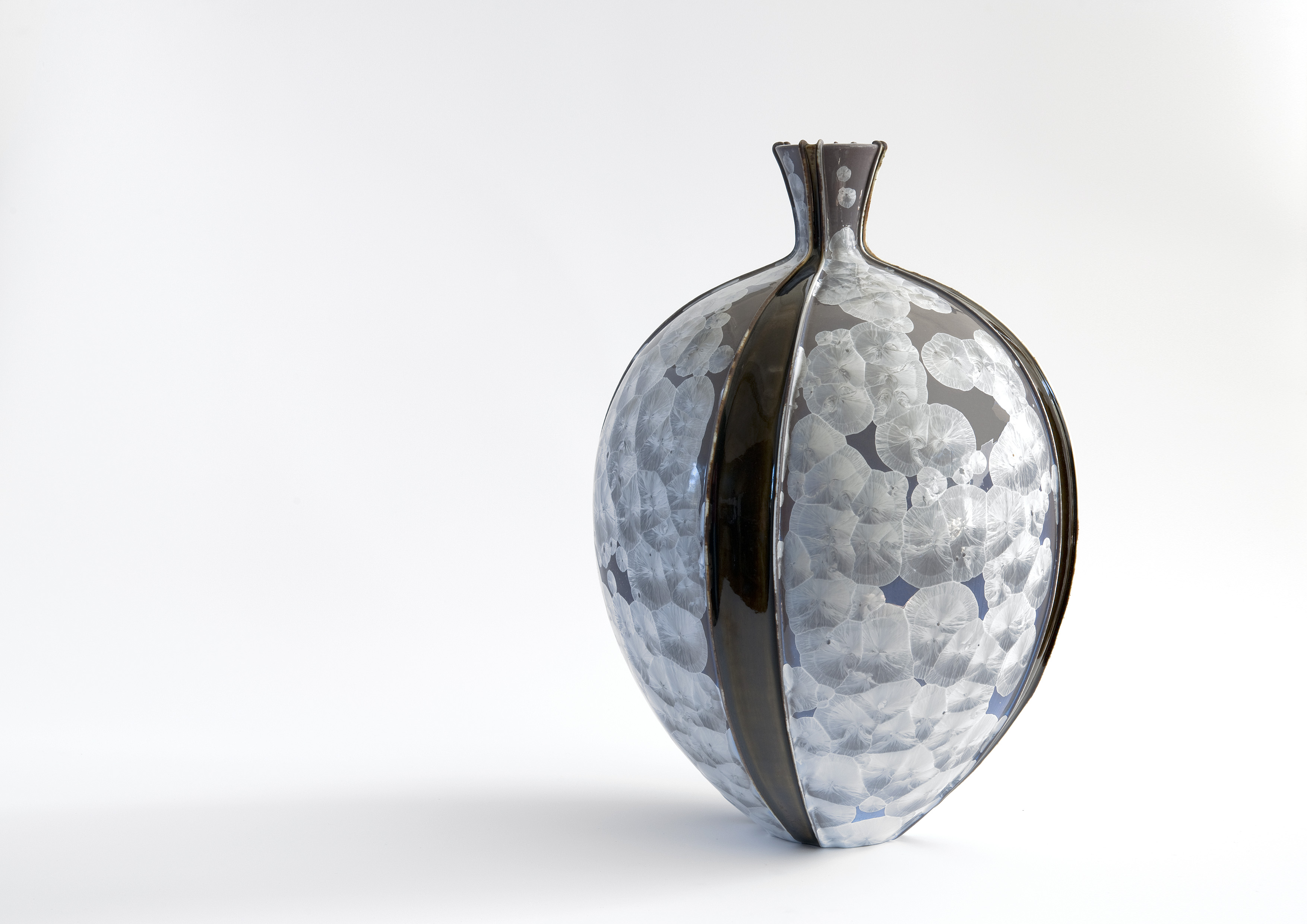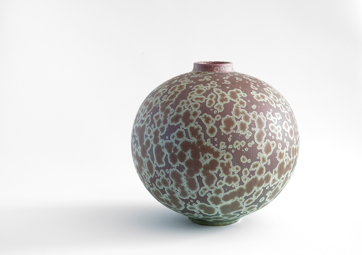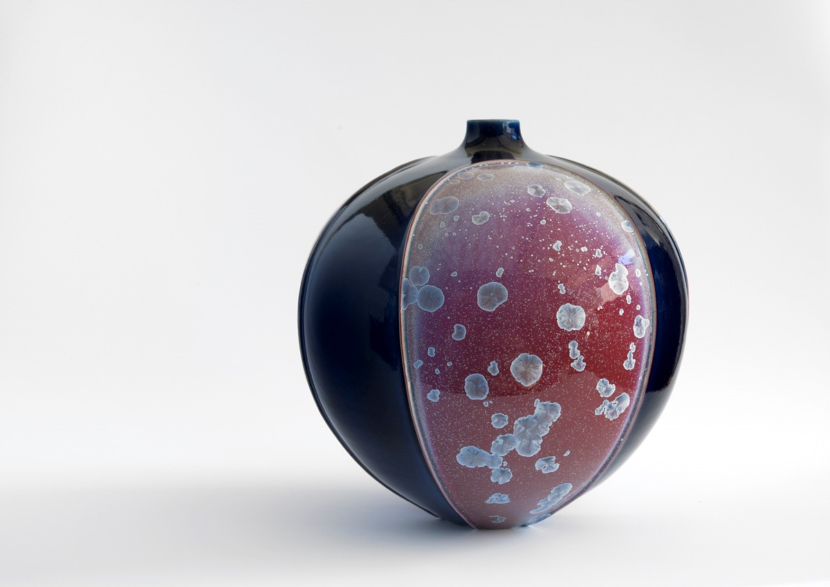 Ted Secombe is well known for his beautiful crystalline glazes, as well as his pots of cobalt blue and deep crimson. He works with a huge range of colours and, as with his forms, Ted is always experimenting and developing new ranges of glazes, some of which are reminiscent of ancient Chinese glazes. The glazes involve different firing procedures as Ted is always attempting to achieve the best possible results by altering time and temperatures and heating rates to his firings.