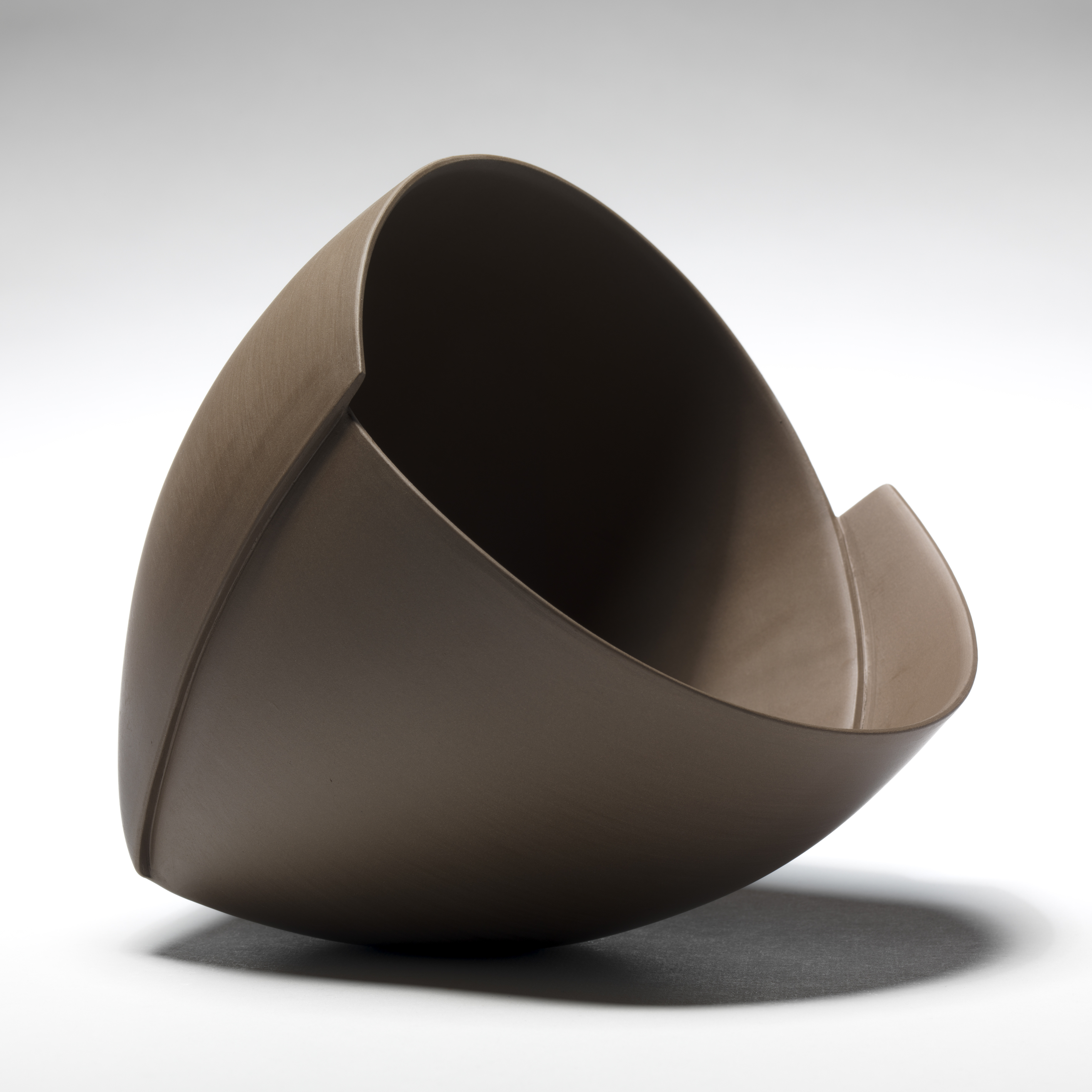 With nothing but a rolling pin and a few simple hand tools, Ann Van Hoey’s impossibly thin clay slabs are rolled out and cut into carefully designed puzzle pieces. These pieces are reassembled on a hemispherical plaster mold, where all seams are carefully erased. It is only after the gossamer hemispheres of clay have been assembled that her true wizardry occurs. She makes a few deft slices in the side of the bowl, applies a thin bead of glue-like slip and with a few quick folds, secures them into their final shape.