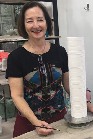 Julie’s art practice is based upon a long-term interest in contemporary issues while extending the field of ceramics practice by challenging its materiality and traditions. Previously she focused on consumer culture, specifically the relationship between female identity and global branding within the context of western and eastern cultures. Recent concerns explore the precarious existence of threatened Australian birds and flowers. Julie’s interest in environmentalism continues with a project investigating the science of ice core extraction. Drilling expeditions collect cores embedded with information providing an understanding of climate change to the earth over thousands of years. A new series of ceramic and cast glass columns depict ice cores with horizontal striations that refer to layers of annual snowfall. The coloured bands describe scientific data collected from an ice core extracted in the Australian Antarctic Territories. The translucent, material qualities of glass and ceramics make visible evidence of climate change hidden within the glaciers and ice beds of Antarctica.