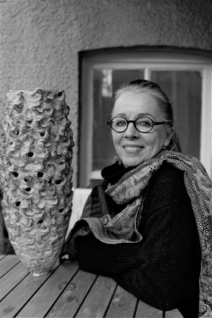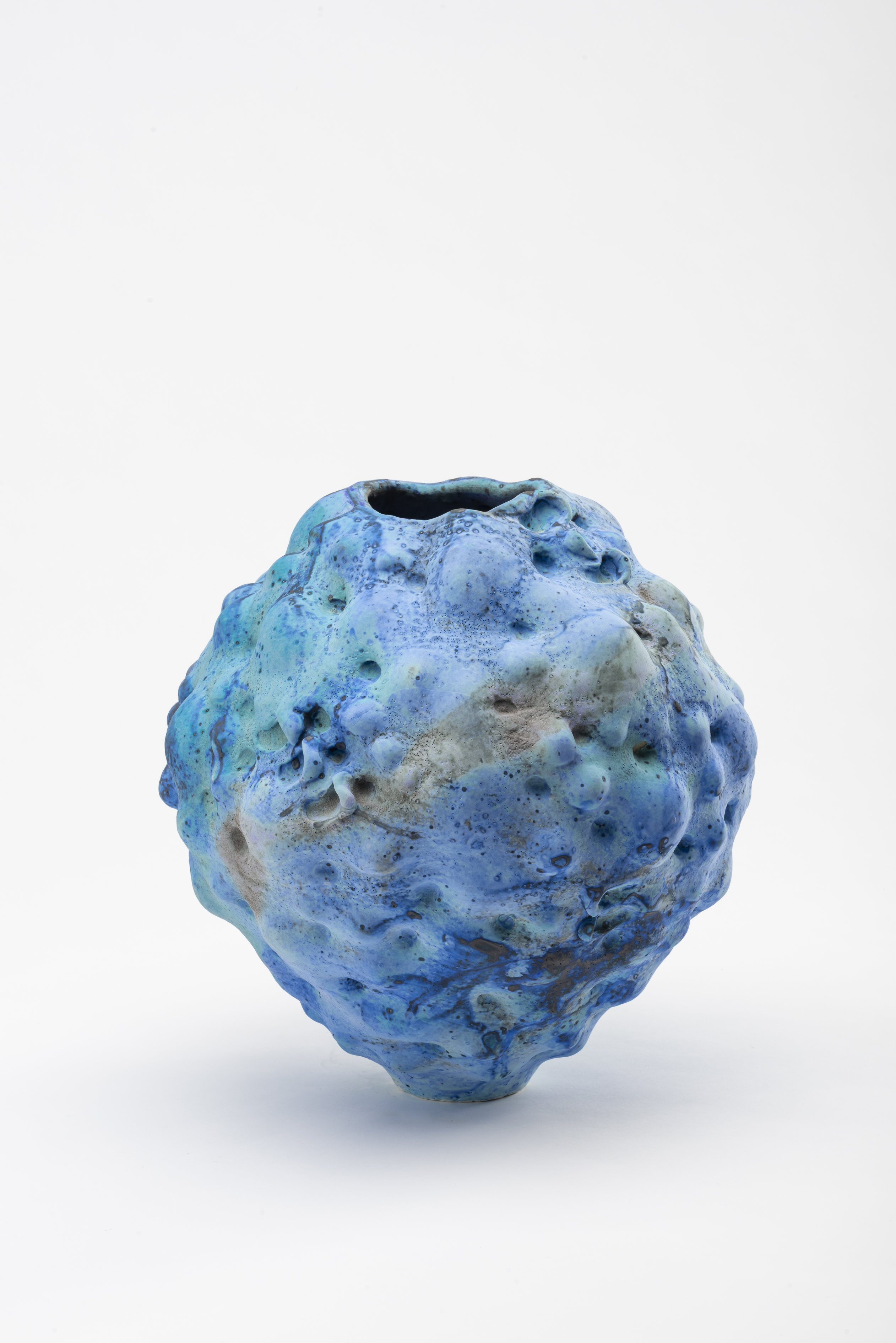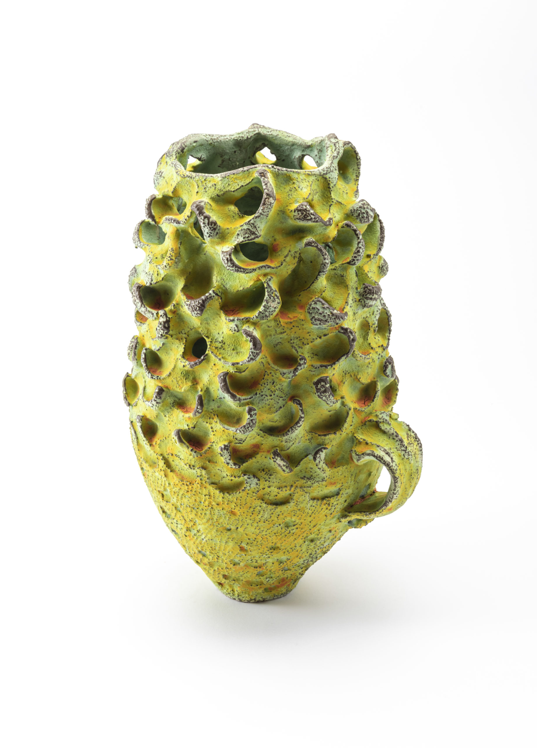 The work is coil thrown, manipulating and texturing as I work with quick burner drying. Through this process I try to capture the inherent natural movement of clay. Texture, slips and finally a number of painterly thin applications of dry glazes are layered onto the work, culminating with multiple firings.