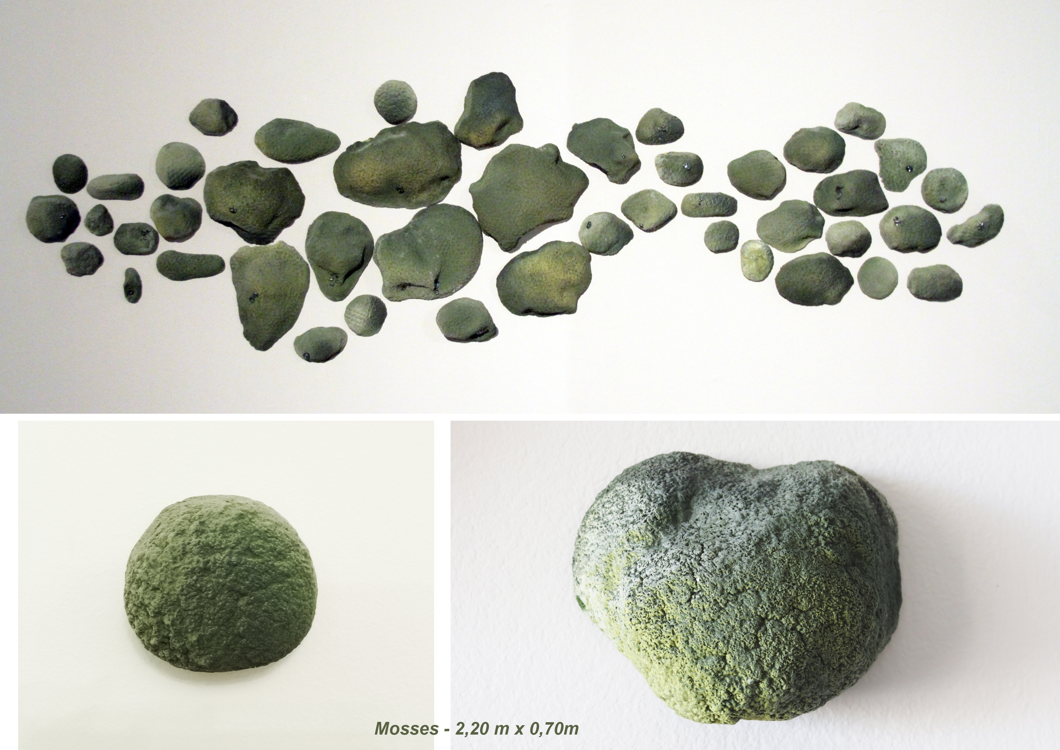 I create mosses that grow abundantly and anywhere, on the roofs of houses, rocks, walls, tree trunks, on walls and on the ground, in damp places. They survive during the dry season at the end of which they exhibit extreme wilting; they get back to life with the rains and reproduce taking advantage of these conditions. Somehow I am talking about the adaptive power they have, as well as human beings, who due to different circumstances or problems, seem to wilt and then be reborn again.