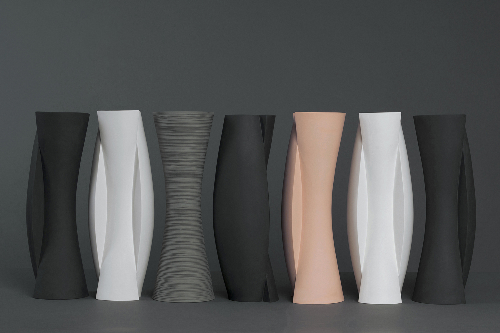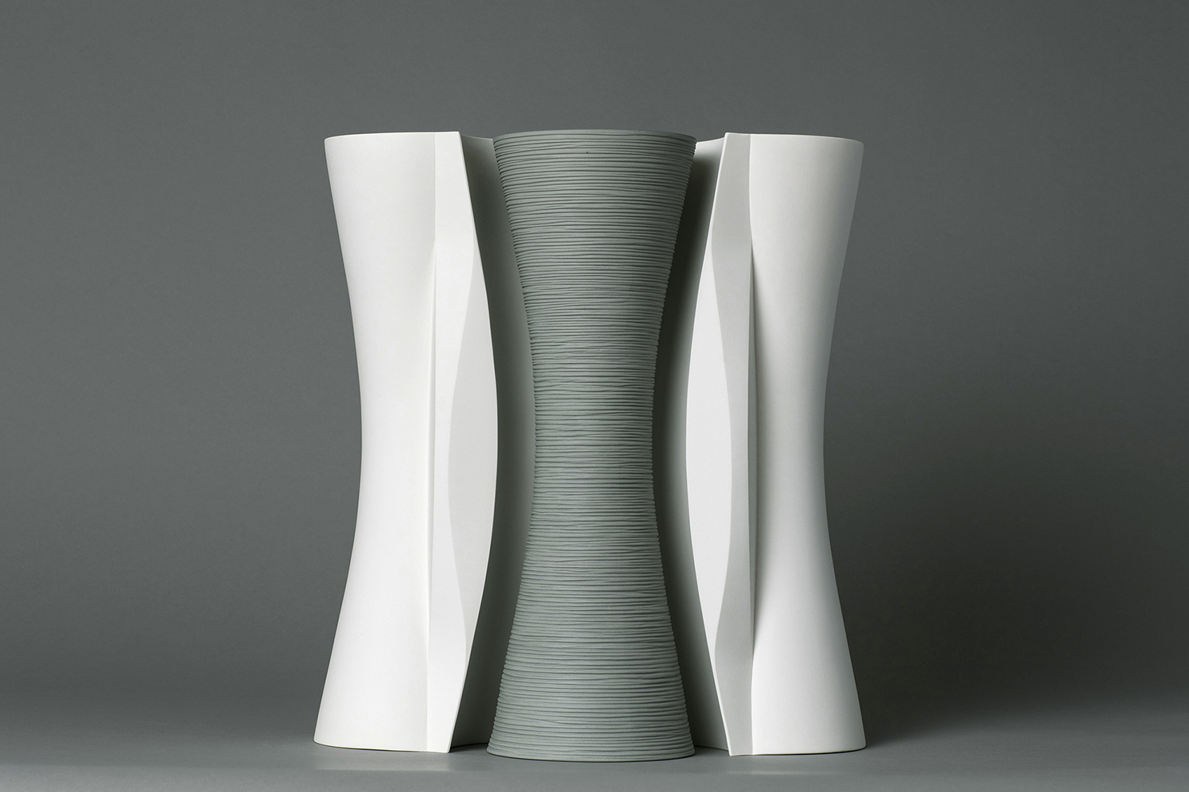 Lea Georg has dedicated herself to the topic of the “vessel object” for years. Based on simple convex and concave vase forms, she creates pairs or sets of three to nine porcelain pieces consisting of vessels and closed porcelain bodies. These shapes complement each other and allow them to be joined together.