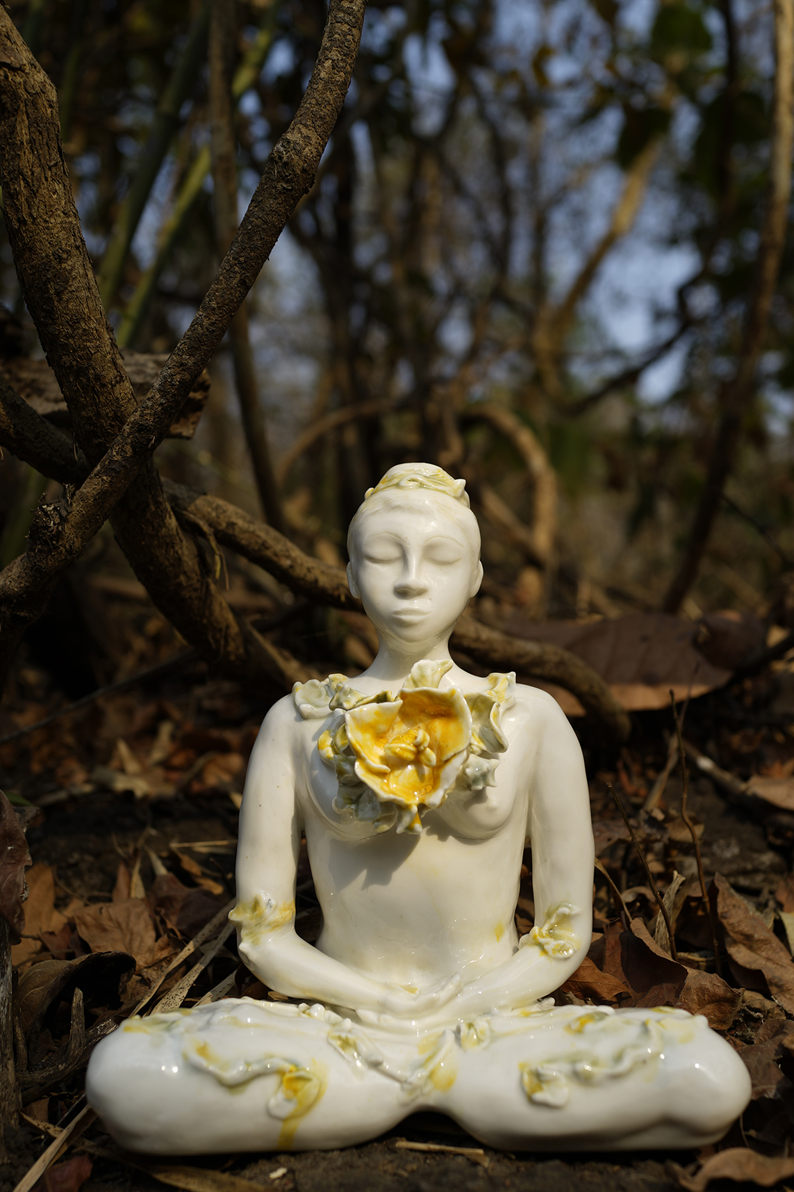 My work bridges intuitive thoughts arising within, from deep silence, expresses it in symbols, through the experience of the relationship between inner and outer worlds, which flows into figurative, sculptural ceramic forms. The journey is finding integration, through inspirations from anatomical studies, Buddhist and Jain temple iconology, patterns in nature, engagements with traditional crafts and impressions from spiritual practices.