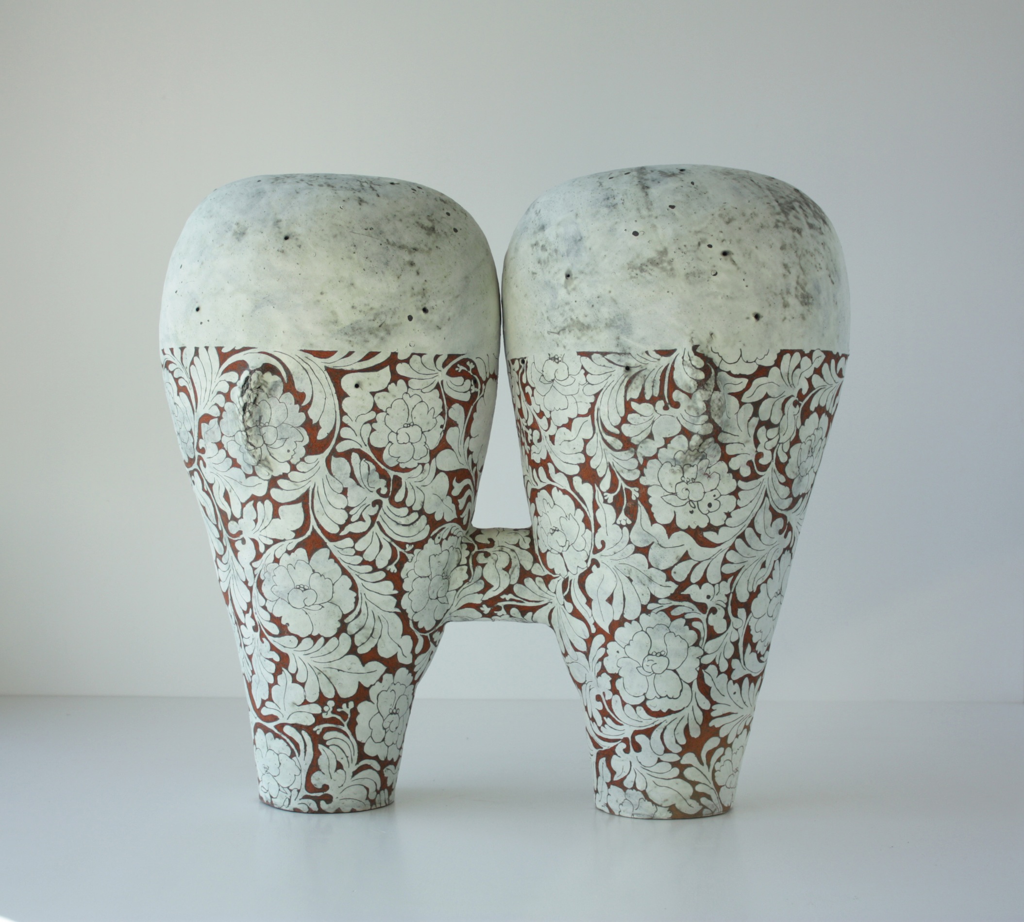Terre fumée, grès, raku, porcelaine, simples traits ou arabesques florales, sont comme des vêtements stricts ou sensuels partageant le monde à part égale entre masculin et féminin. La couleur se partage de la même façon en restant sourde et délicate ou en introduisant un certain désordre par sa brutalité parfois radicale.